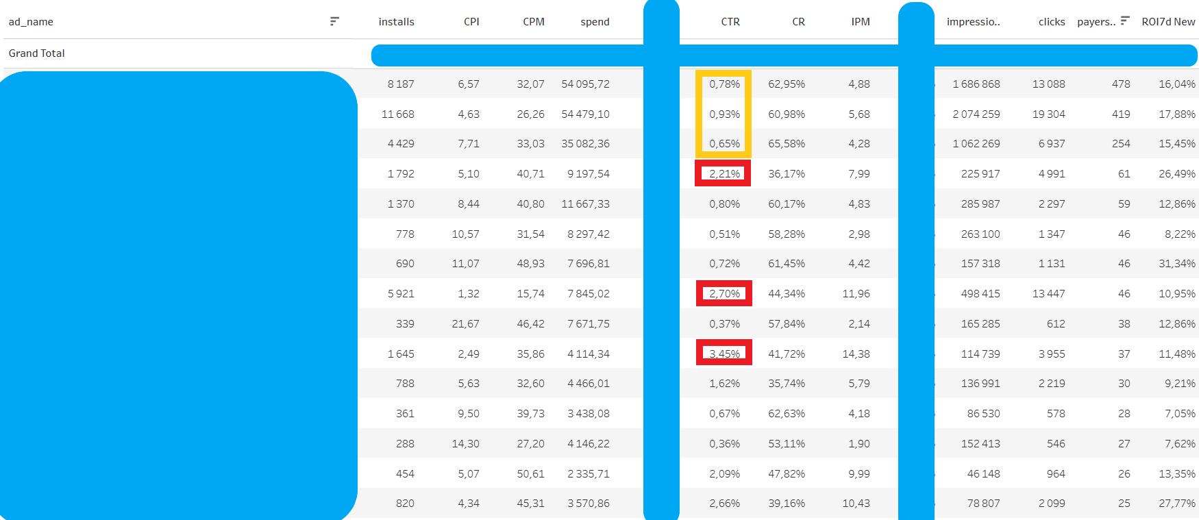 Обратите внимание на скриншот. На нём представлены данные по закупке за некоторый период времени. Данные отсортированы по payers - очевидно, что нашу оценку силы креатива подкрепляет продолжающаяся закупка, которая ведёт к увеличению количества платящих. И обратите внимание на рамки. Жёлтые рамки - CTR топовых креативов. Красные - CTR креативов с хорошим перформом, но которые не обеспечивают стабильную закупку в kpi.