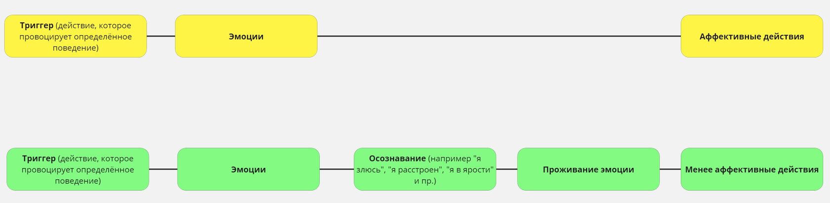 Второй сценарий я выработал после общения с психотерапевтом. Отличие в том, что когда я получаю какой-то триггер, я сразу наблюдаю состояние и эмоцию (для простоты возьмём одну), в которой сейчас пребываю.